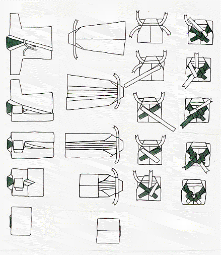 • HAKAMA folding: hold up from the back, push the partition inside to the right and lay flat on the floor with back side up; fold HIDA so that they overlap; turn HAKAMA over; straighten the sides at the seams, then fold the front HIDA; fold the sides in to the width of DOGU BUKURO; fold the lower third up, then the next third; flip over, then tie the HIMO